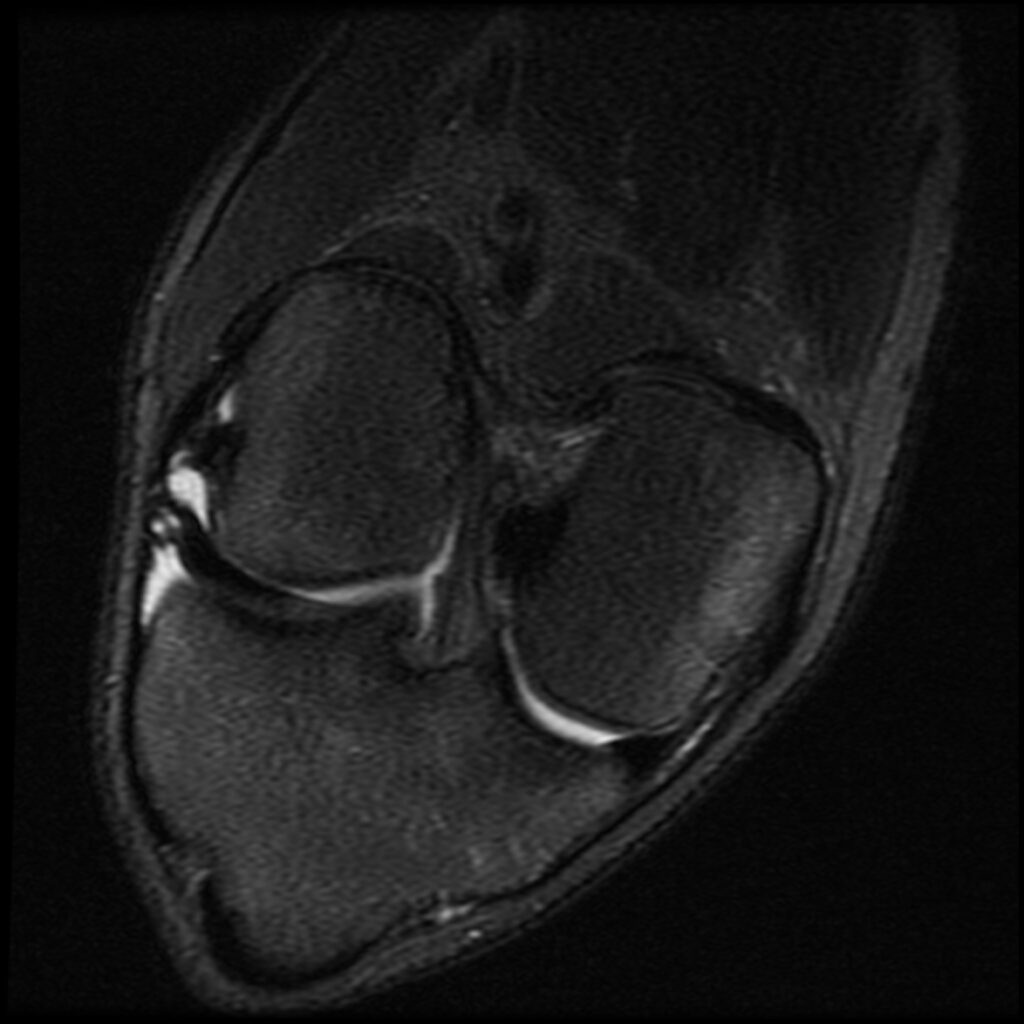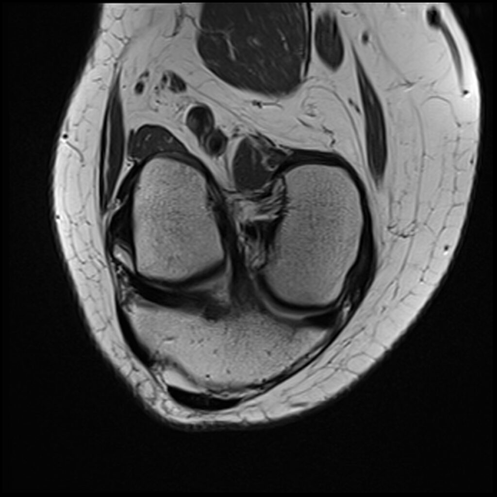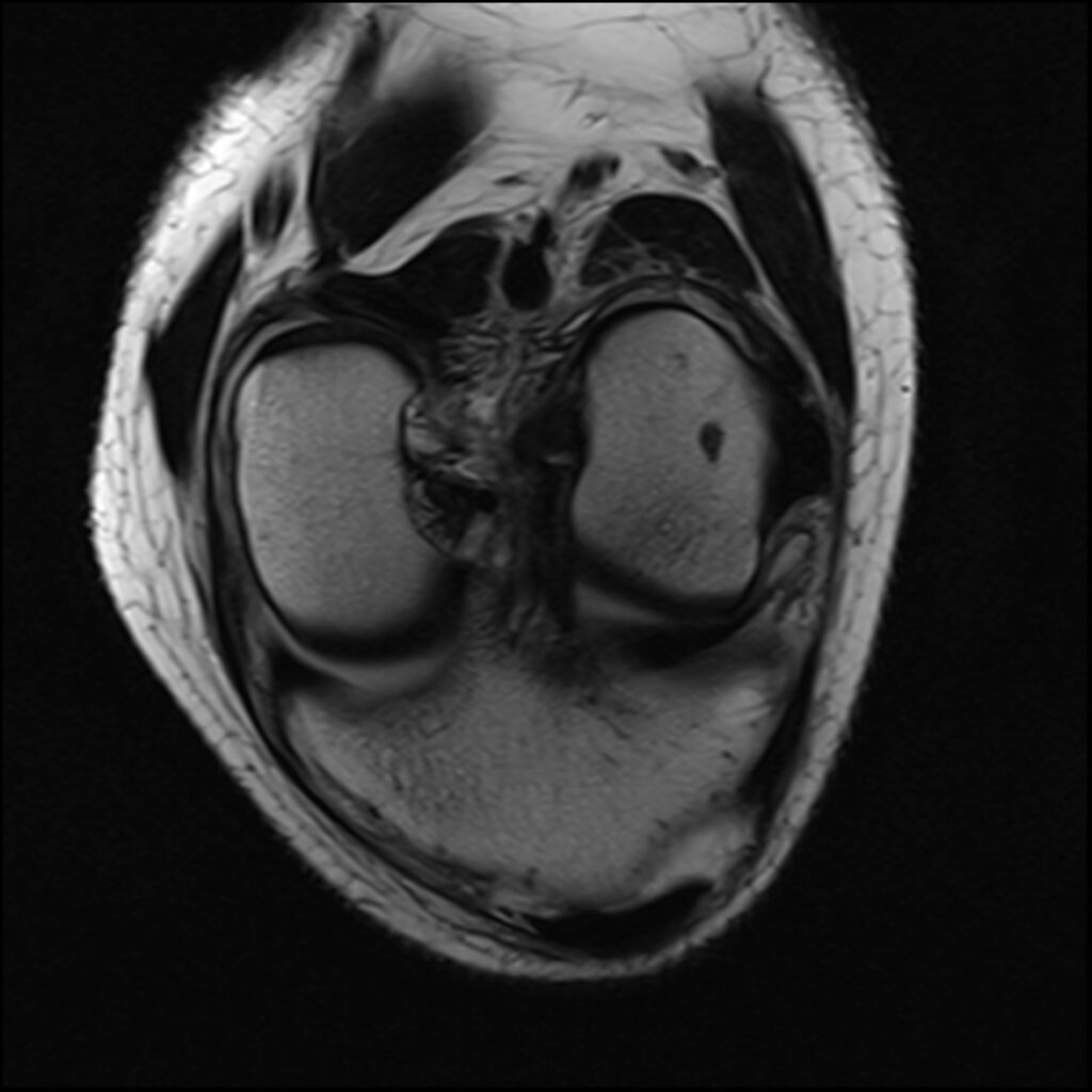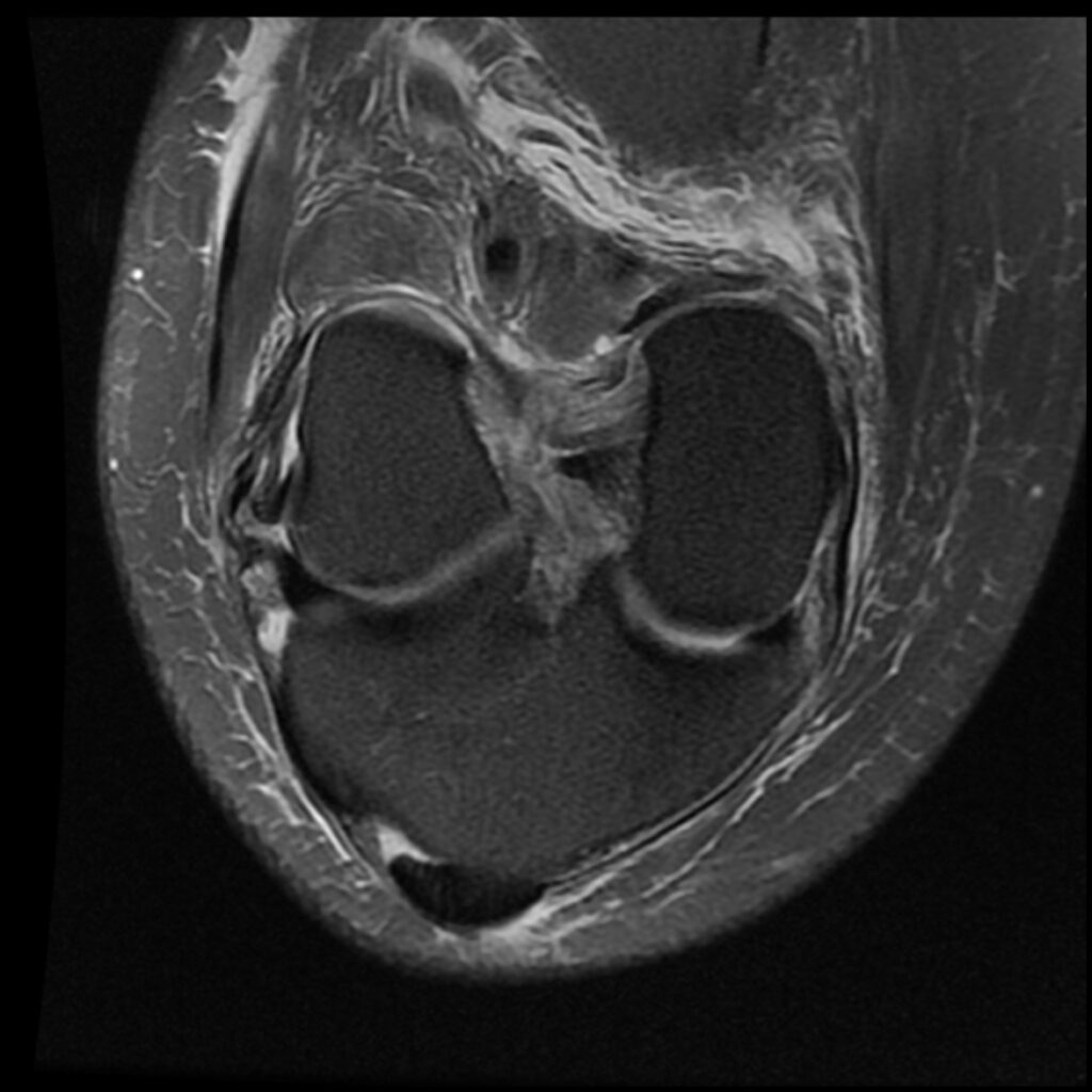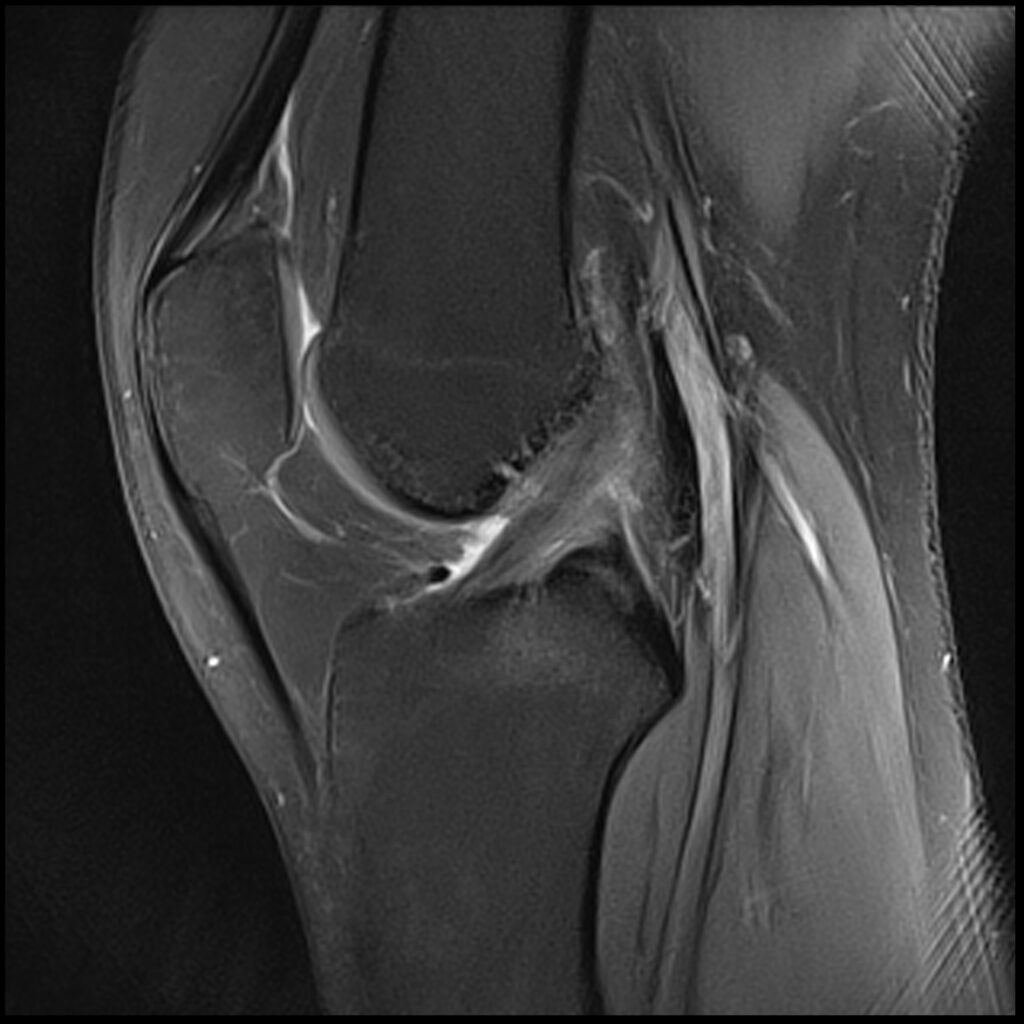 Patient P, age 20, was playing soccer when his running foot got planted and stayed in the same position while his body continued going forward and rotated around the knee. This is the pathognomonic soccer ACL injury players try to avoid when they “tuck & roll” rather than resist going horizontal. Soccer players tend to have longer careers than their American football counterparts because they never resist falling and going down. Tucking & rolling redirects the force rather than meeting the momentum head-on. The tucking part forces your bones and joints into optimal alignment and flexion, adding obstacles to injury if I may be so bold. P was given the same initial treatment and aftercare as patient D, aspirating any effusion and again treating the posterolateral origin of the ACL. His first follow-up was at 16 weeks. His MR demonstrated complete re-ligamentization of the ACL. He stated that he had already been symptom-free and back to playing soccer regularly, only wearing a neoprene sleeve to remind him to be careful.