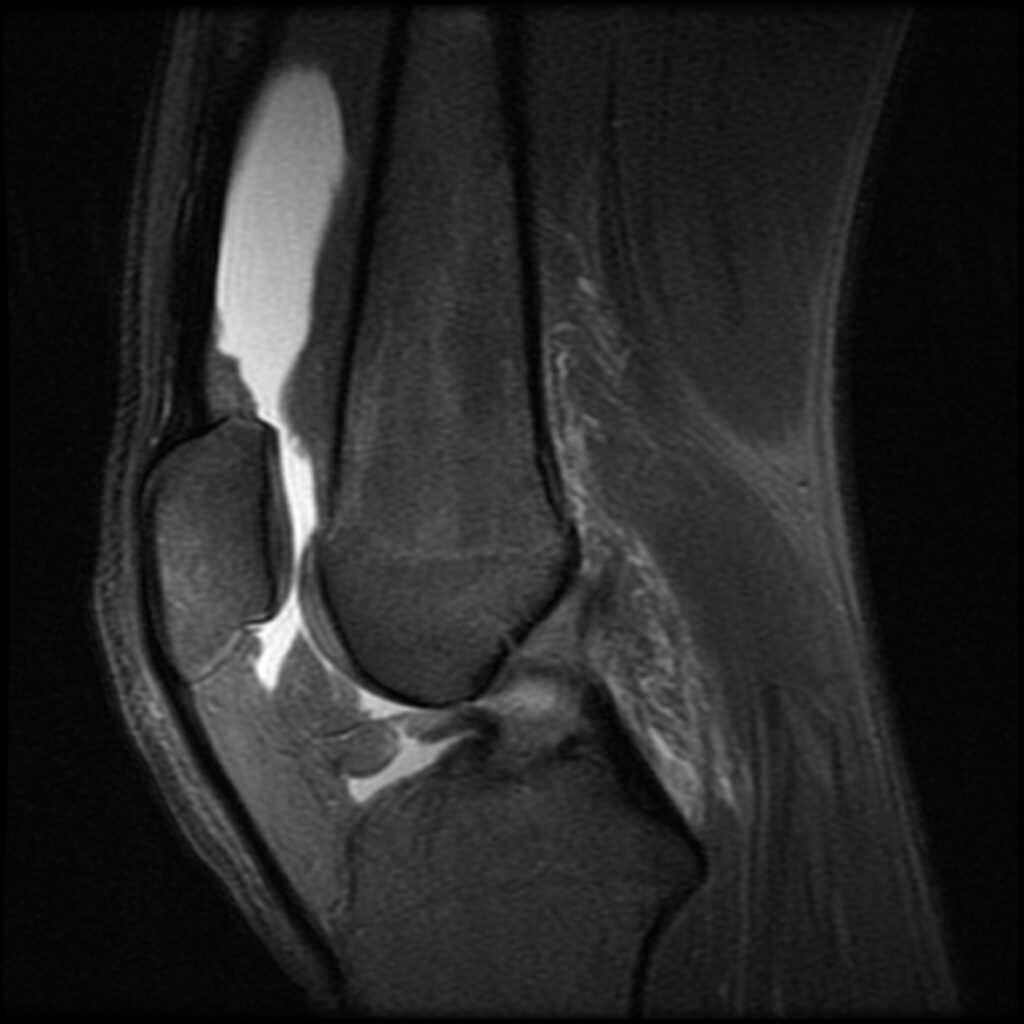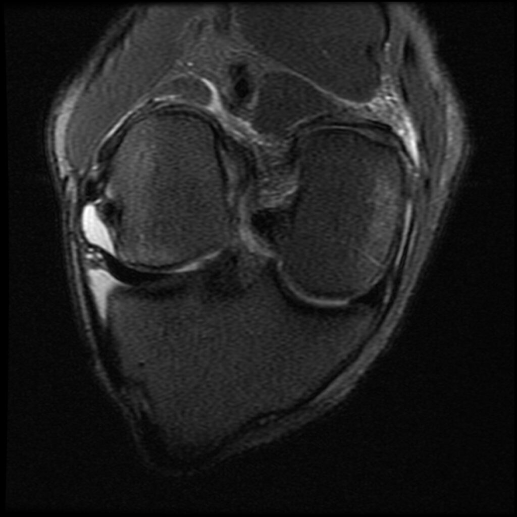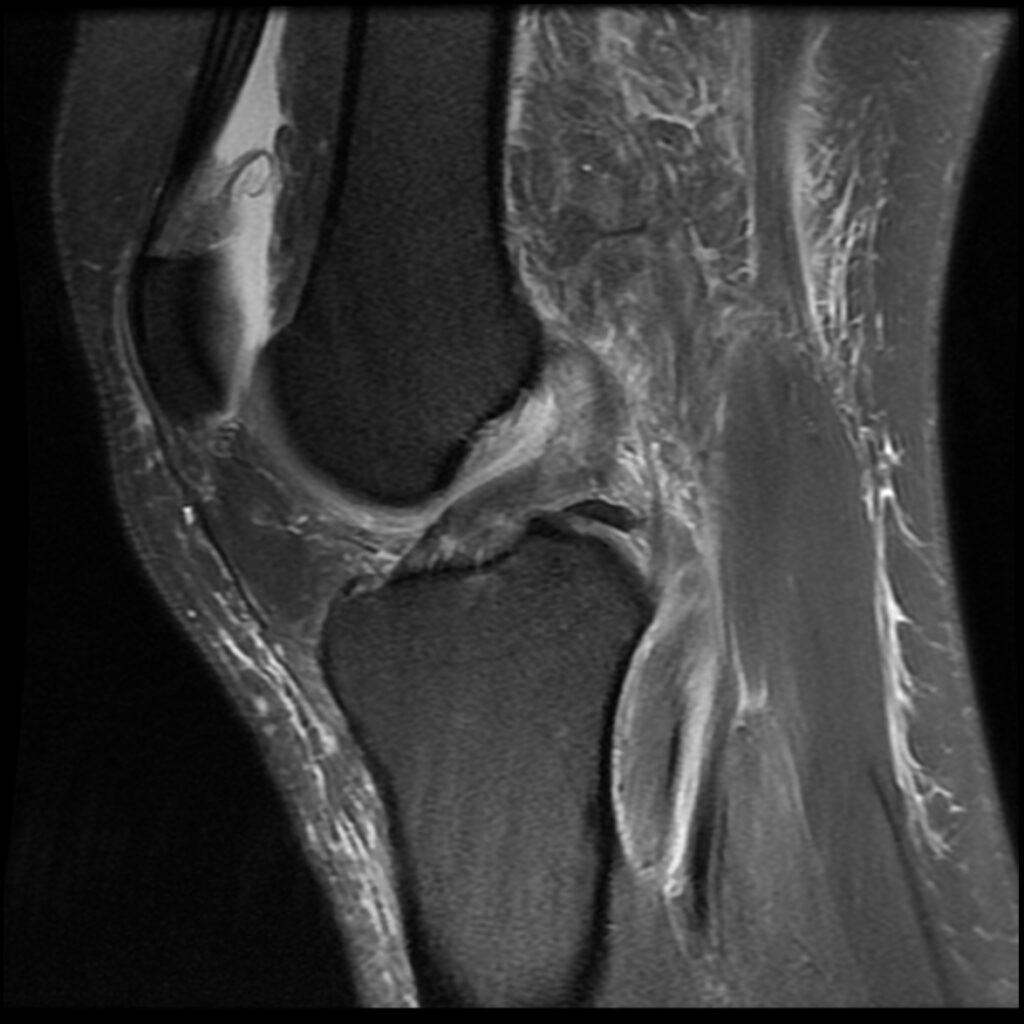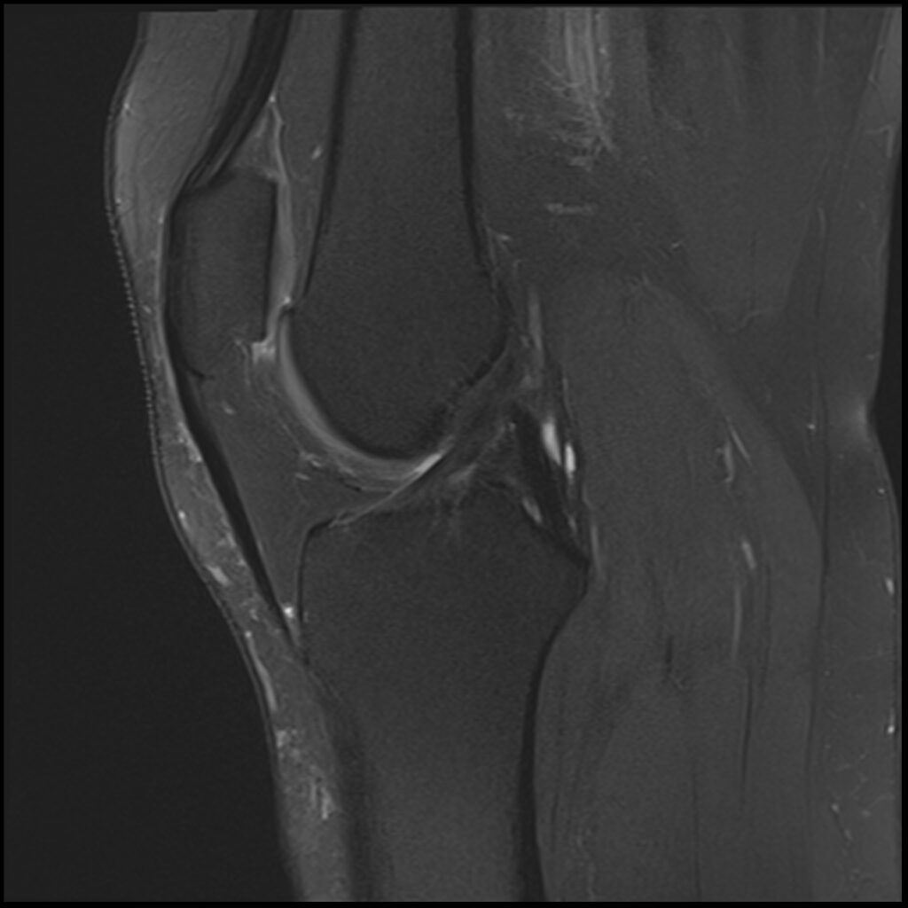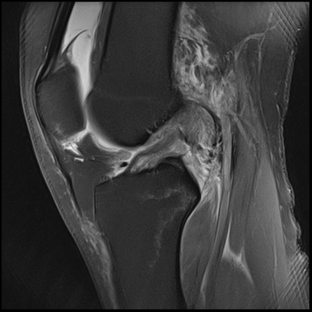 Patient C, age 44, was jumping on a trampoline when her foot got caught during rebound landing and forced the knee to extend and twist, tearing her ACL and medial meniscus and causing a Segond’s fracture, a posterolateral compression injury seen on the T2 sagittal MR images. Immediately upon becoming aware of her ACL injury, she asked my staff if she could put her “before & after” MR scans on my practice’s website after it healed. The initial treatment and aftercare were the same as patient D, aspirating any effusion and treating the posterolateral origin of the ACL. At 8-week follow-up, her knee was treated with hypertonic dextrose, with the collateral ligaments being treated with DGP. She was treated again at 16 weeks with another autologous PRP treatment of the knee joint, ligaments, and tendons. She was released to full sports and activities at 18 weeks post-injury. Subsequent MR scan revealed complete recovery of her ACL. Low grey signal replaced the original high signal intensity tear in the meniscus, appearing healed. Her knee was reported to be symptom-free at 5-year follow-up.