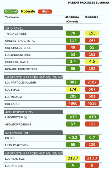 Aggressive therapy was decided upon after consultation with this engaged and motivated patient. In this case, the patient responded even better than expected. There are some cases where patients may not respond well to diet, lifestyle and or supplements. In other cases, diet and exercise can be enough. Sometimes natural treatment works well but lipid targets aren’t achieved, so a prescription is needed in addition. The goal is always to optimize lipid levels and achieve the best possible outcome for the patient by using whatever it takes to get there.