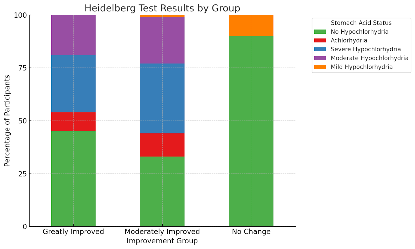 Results of Heidelberg testing showed that 55% of those in the “Greatly Improved” group had moderate to severe hypochlorhydria, 50% of those in the “Moderately Improved” group had moderate to severe hypochlorhydria, and none of those in the “No Change” group had moderate to severe hypochlorhydria.