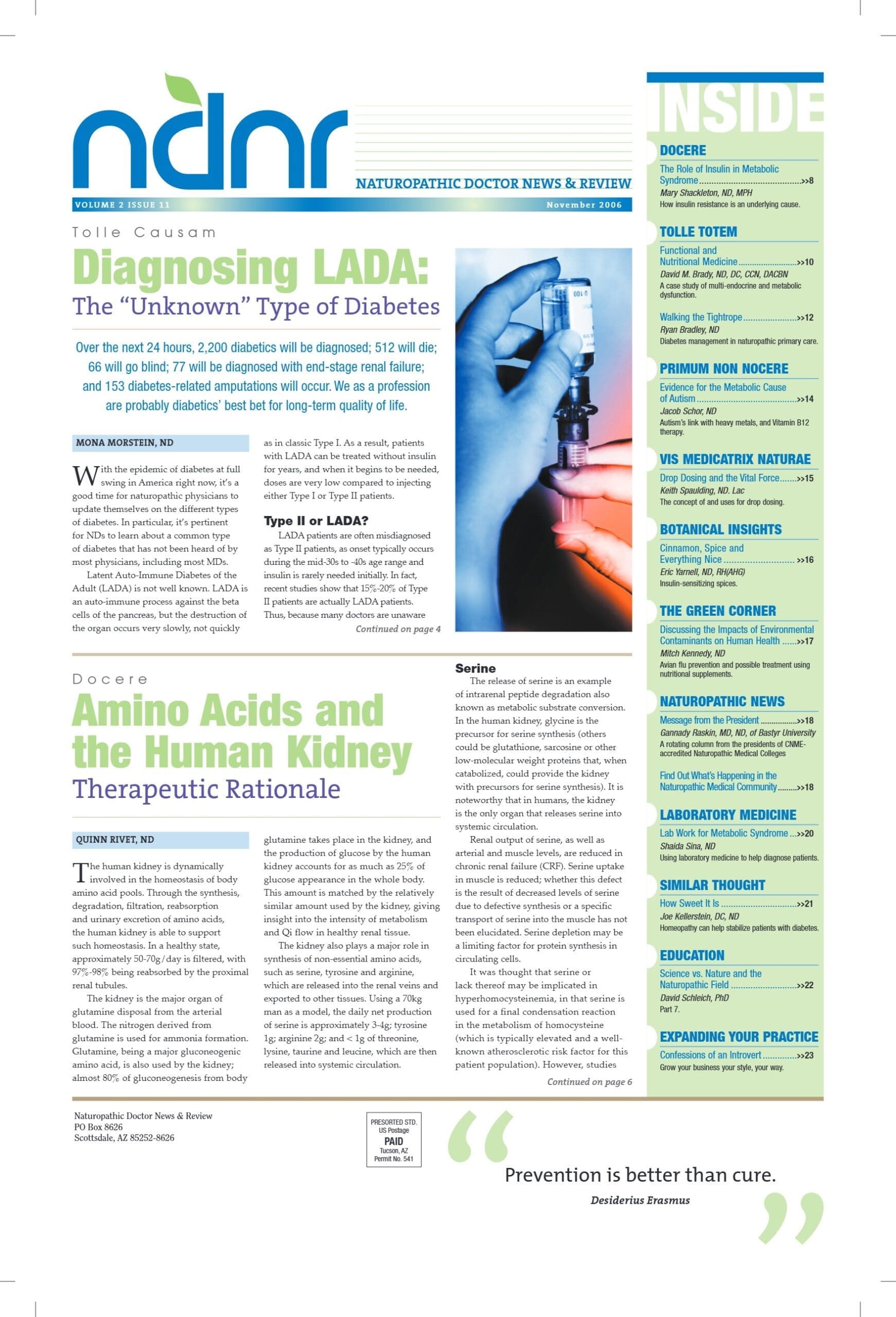 Diagnosing LADA: The “Unknown” Type of Diabetes...............................>> cover Mona Morstein, ND Amino Acids and the Human Kidney Therapeutic Rationale.................................>> bottom of cover Quinn Rivet, ND The Role of Insulin in...
