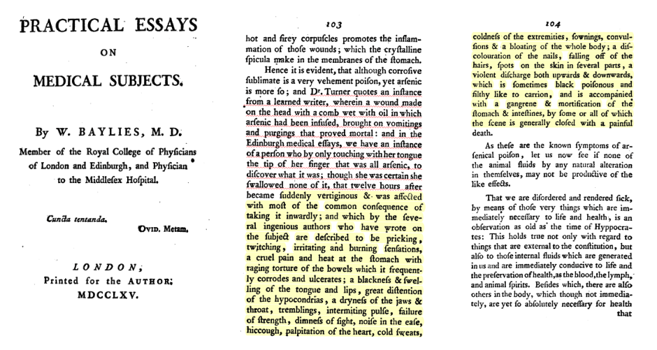 “Dr. Turner quotes an instance from a learned writer, wherein a wound made on the head with a comb wet with oil in which arsenic had been infused, brought on vomitings and purgings that proved mortal: and in the Edinburgh medical essays, we have an instance of a person who by only touching with her tongue the tip of her finger that was all arsenic, to discover what it was; though she was certain she swallowed none of it, that twelve hours after became suddenly vertiginous & was affected with most of the common consequence of taking it inwardly; and which by the several ingenious authors who have wrote on the subject are described to be pricking, twitching, irritating and burning sensations, a cruel pain and heat at the stomach with raging torture of the bowels which it frequently corrodes and ulcerates; a blackness & swelling of the tongue and lips, great distension of the hypocondrias, a dryness of the jaws & throat, tremblings, intermiting pulse, failure of strength, dimness of sight, noise in the ears, hiccough, palpitation of the heart, cold sweats, coldness of the extremities, sownings, convulsions & a bloating of the whole body; a discolouration of the nails, falling off of the hairs, spots on the skin in several parts, a violent discharge both upwards & downwards, which is sometimes black poisonous and filthy like to carrion, and is accompanied with a gangrene & mortification of the stomach & intestines, by some or all of which the scene is generally closed with a painful death.”